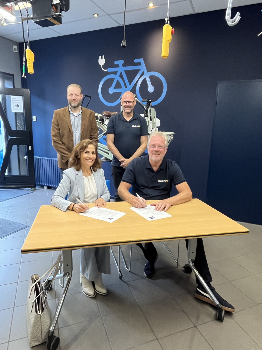 Vlnr voor: Nahid Rezwani, directeur bij Innovam en Richard ten Damme, Head Learning & development bij KwikFit. Vlnr achter: Yvo van Rotterdam, projectleider Tweewieler Academy en John Altena, technisch trainer bike bij KwikFit.