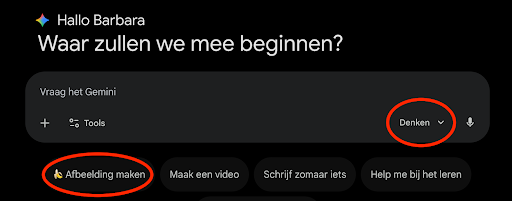- Open Gemini en kies Afbeelding maken (en waar beschikbaar Denk/Pro als je consistentie wilt).