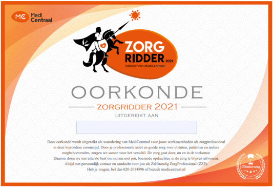 De onderscheiding is een extra blijk van waardering voor het werk van zorgprofessionals in het afgelopen jaar. Onder grote druk en onzekerheid hebben zij in de coronaperiode keihard gewerkt en fantastische zorg verleend. De ZorgRidder oorkonde is een sympathiek gebaar en geldt als een hart onder de riem voor zorgmedewerkers. Roy Krautscheid, oprichter van MediCentraal en zelf als verpleegkundige opgeleid vertelt: “Ik ben enorm trots op de zorgprofessionals in Nederland. En in het bijzonder de zelfstandige zorgprofessionals die via MediCentraal zo’n uitzonderlijke prestatie hebben geleverd. Met de benoeming van deze zorgverleners tot ZorgRidder willen we duidelijk maken dat we heel dankbaar zijn voor hun harde werk.”