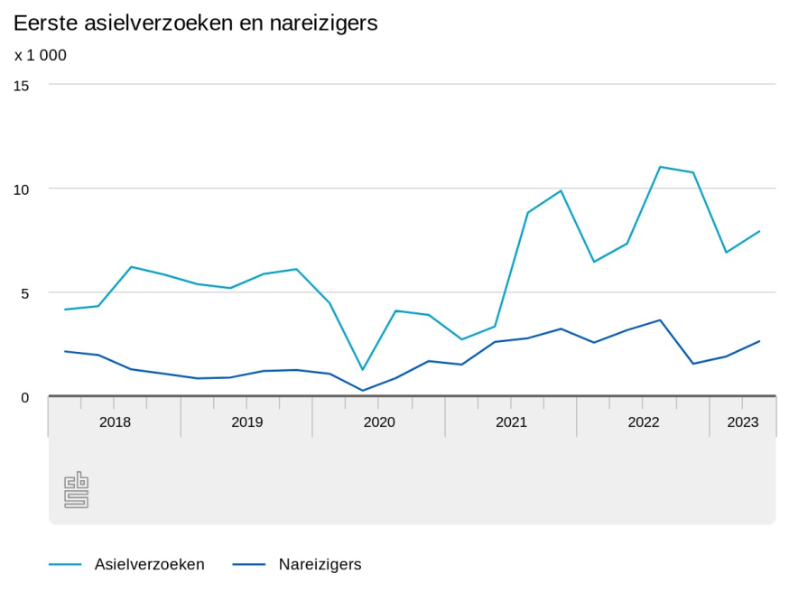 In het tweede kwartaal van 2023 hebben 7,9 duizend mensen een eerste asielverzoek in Nederland ingediend. Dat is 15 procent meer dan in het eerste kwartaal van 2023. Ook kwamen er meer nareizigers naar Nederland dan vorig kwartaal, maar het waren er minder dan een jaar eerder. Dit meldt het CBS op basis van de nieuwste asielcijfers van de Immigratie- en Naturalisatiedienst (IND).