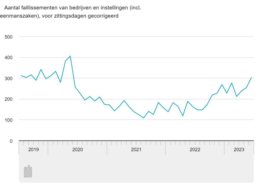 Het aantal voor zittingsdagen gecorrigeerde faillissementen fluctueert aanzienlijk. Dalingen en stijgingen volgen elkaar snel op. Het aantal uitgesproken faillissementen piekte met 911 in mei 2013. Daarna nam het aantal faillissementen tot en met augustus 2017 af. Vervolgens bleef de trend tot medio 2020 redelijk vlak. Daarna is het aantal faillissementen verder afgenomen en bereikte in augustus 2021 met 109 een laagterecord. Vanaf mei 2022 lag het aantal faillissementen onafgebroken hoger dan in dezelfde maand een jaar eerder. In juni 2023 waren er voor het eerst in ongeveer 3 jaar meer dan 300 faillissementen.