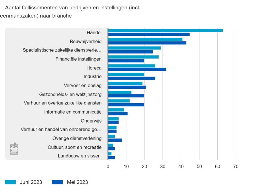 De handel behoort tot de bedrijfstakken met de meeste bedrijven. Relatief gezien werden er in juni de meeste faillissementen uitgesproken in de sector horeca.