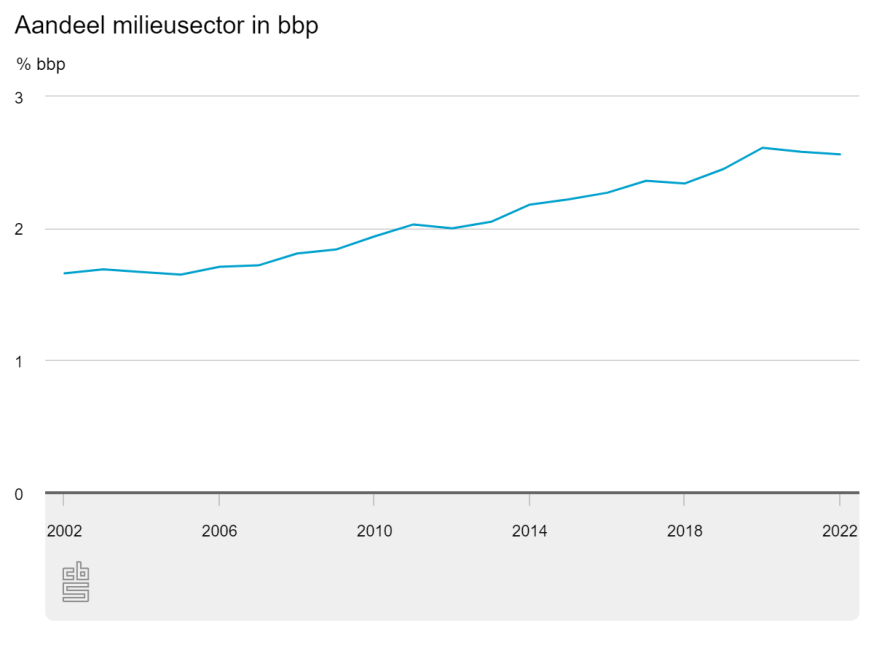 In de afgelopen twintig jaar is de toegevoegde waarde van de milieusector verdrievoudigd. De bijdrage van de milieusector aan de Nederlandse economie blijft echter beperkt, en is in dezelfde periode met ruim de helft toegenomen van 1,66 procent tot 2,56 procent van het bbp. Dit blijkt uit de nieuwste cijfers van het CBS, bestaande uit gedetailleerde cijfers tot en met 2021 en een snelle raming voor 2022.