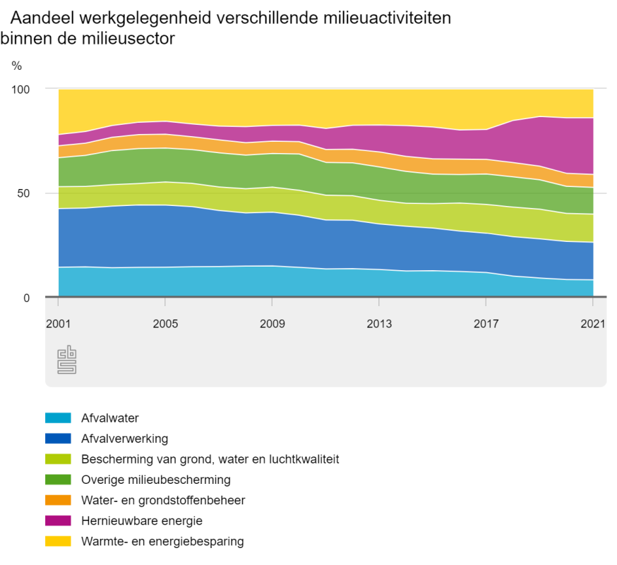 In 2021 leverde de productie van hernieuwbare energie (bijv. energie uit wind en zon) de belangrijkste bijdrage, met 27 procent van alle werkgelegenheid. Ook de bestrijding van luchtvervuiling en de uitstoot van broeikasgassen is flink gegroeid tot bijna 7 procent van alle werkgelegenheid. Het aantal banen in de warmte- en energiebesparing is over de totale periode van twintig jaar echter met slechts 2 procent toegenomen. Daarmee is dit aandeel in de totale werkgelegenheid van de milieusector sterk gedaald, tot minder dan 14 procent.