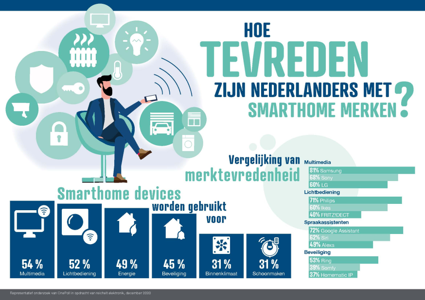 Uit het onderzoek komt naar voren dat multimedia (54 procent), lichtbediening (52 procent) en energieregeling (49 procent) bij Nederlanders de meest gebruikte smarthometoepassingen zijn. Deze toepassingen staan bij de leeftijdscategorieën 18 tot 24, 35 tot 44 en 55+ in de top drie. Bij de leeftijdsgroepen 25 tot 34 en 45 tot 54 wordt lichtbediening echter vervangen door beveiliging (zoals beveiligingscamera’s en rookmelders) en staat het bij beide groepen op nummer twee. Opvallend is dat iets meer dan de helft (52 procent) van de 25 tot 34-jarigen aangeeft gebruik te maken van slimme beveiligingsproducten, terwijl dit maar het geval is bij ruim een kwart (27 procent) van bij 55-plussers. Schoonmaken (bijvoorbeeld met behulp van een robotstofzuiger) of binnenklimaattoepassingen zijn minder populair (beide 31 procent).