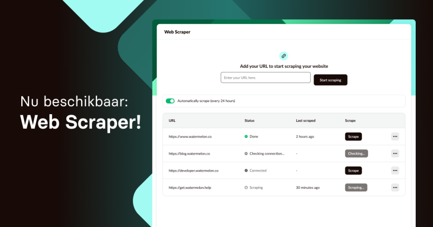 AI-startup Watermelon lanceert op donderdag 8 juni een nieuwe functie binnen hun AI-klantenservicesysteem: ‘web scraper’. Met deze toevoeging in het systeem kun je met behulp van enkel een websitelink alle informatie van deze (bedrijfs)website toevoegen aan een chatbot. Op deze manier kun je in een handomdraai grote hoeveelheden informatie toevoegen aan de chatbot en is deze altijd voorzien van actuele informatie.