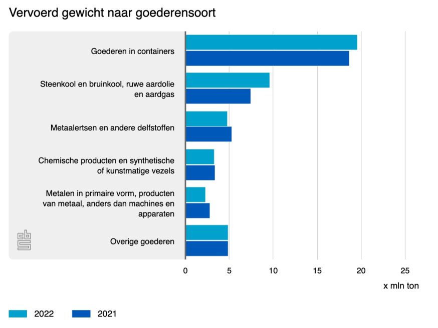 Het aantal vervoerde containers steeg met 3,7 procent. Naar en vanuit Nederland gaan veel goederen in containers van en naar Duitsland en Italië. De aan- en afvoer van goederen in containers van en naar deze landen groeiden in 2022 met respectievelijk 12,0 en 5,6 procent.