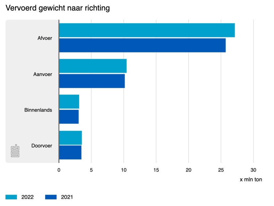 De meeste over het spoor vervoerde goederen worden in Nederland geladen en in het buitenland gelost. Deze goederenstroom steeg tot 27,2 miljoen ton in 2022, 5,6 procent meer dan een jaar eerder. Vooral de afvoer van kolen naar Duitsland nam toe, met 27,8 procent. De aanvoer van goederen, 10,5 miljoen ton, steeg met 2,8 procent. Deze toename bestond vooral uit goederen in containers (+ 2,9 procent) en producten van de landbouw, bosbouw en visserij die in bulk worden vervoerd (+ 35,6 procent). Binnen deze laatste groep gaat het onder andere om graan en mais.Ook de doorvoer van goederen, oftewel het vervoer tussen twee buitenlandse plaatsen via het Nederlandse spoor, en het binnenlands vervoer zijn het afgelopen jaar gestegen, met respectievelijk 3,1 procent en 0,6 procent.