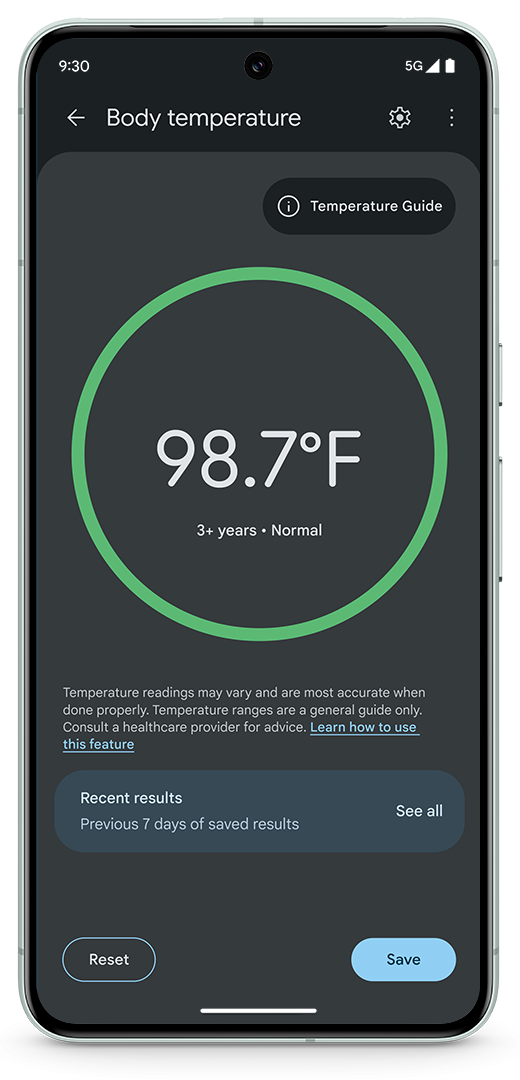 Met de nieuwe medische functie in de Thermometer-app van de Pixel 8 Pro kun je met je telefoon je voorhoofd scannen om nauwkeurig je lichaamstemperatuur te meten. De resultaten zijn eenvoudig op te slaan in je Fitbit-profiel voor beter inzicht in je gezondheid en welzijn.