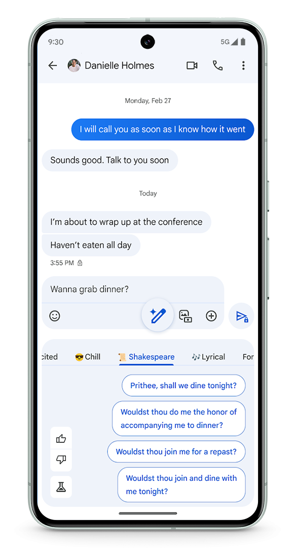 Gebruik de generatieve AI van Google om een opgesteld bericht in verschillende stijlen te herschrijven met Magic Compose, beschikbaar op Pixel 6 en nieuwere telefoons. Je kunt deze functie gebruiken om je berichten bondiger, professioneler of juist dramatischer - zoals Shakespeare - te maken. Dit is allemaal mogelijk op de Pixel 8 Pro dankzij Gemini Nano, Google's meest efficiënte model voor on-device taken.