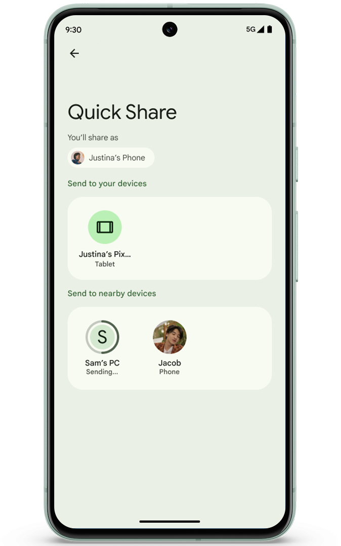 Eerder deze maand kondigden we een update aan voor een van onze meest geliefde functies. Met Quick Share kan je snel foto’s, bestanden en teksten vanaf je Pixel delen naar miljarden compatibele apparaten van het Android, ChromeOS en Windows ecosysteem. Voorheen was Quick Share bekend als Nearby Share. Tik op het nieuwe Quick Share pictogram op het deelblad en je ziet een lijst met apparaten in je buurt waarmee je, zelfs als je offline bent, content kunt delen. Je hebt volledige controle over je privacy en kunt in je instellingen kiezen wie je apparaat kan vinden en bestanden kan verzenden: iedereen, alleen je contacten of alleen je eigen apparaten.