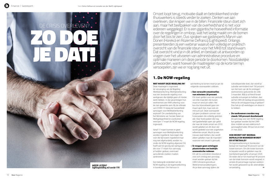 Omzet loopt terug, motivatie daalt en betrokkenheid onder thuiswerkers is steeds verder te zoeken. Denken we aan overleven, dan knijpen we in de billen. Financiële steun doet zich aan, maar het beetpakken van de overheidshand is niet voor iedereen weggelegd. Er is een gigantische hoeveelheid informatie over de regelingen in omloop, wat het lastig maakt om de bomen door het bos te zien. Dus spraken we gastexperts Marvin van Dongen (Horeko) en Rozemie Defrancq (Lightspeed). Onlangs presenteerden zij een webinar waaruit een volledig en praktisch overzicht van de financiële steun voor het MKB tot stand kwam. Dat overzicht vind je in dit artikel, en bestaat uit antwoorden op vragen over het uitvoeren van administratieve procedure en optimale manieren om deze periode te doorkomen. Noodzakelijke antwoorden, want hoewel de maatregelen op de korte termijn versoepelen, zijn we er nog lang niet uit.