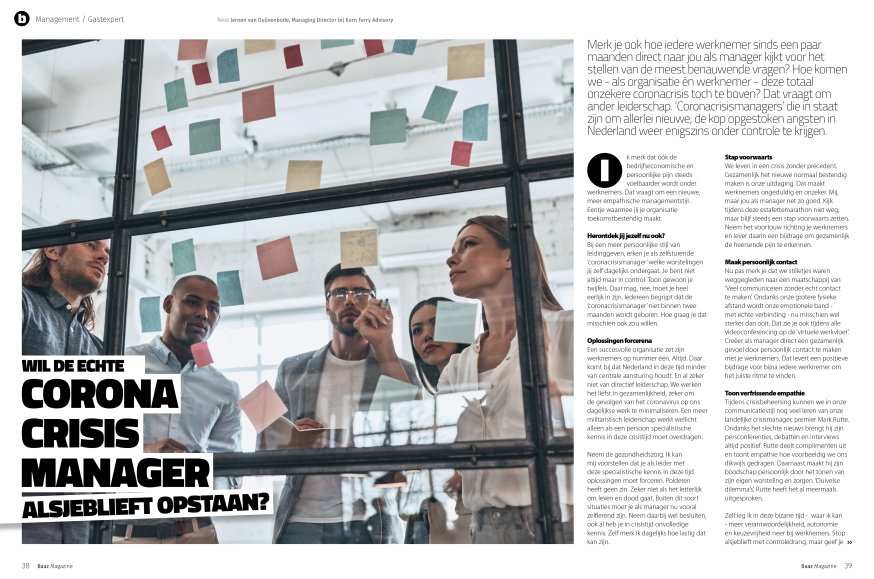 Merk je ook hoe iedere werknemer sinds een paar maanden direct naar jou als manager kijkt voor het stellen van de meest benauwende vragen? Hoe komen we – als organisatie én werknemer – deze totaal onzekere coronacrisis toch te boven? Dat vraagt om ander leiderschap. ‘Coronacrisismanagers’ die in staat zijn om allerlei nieuwe, de kop opgestoken angsten in Nederland weer enigszins onder controle te krijgen.
