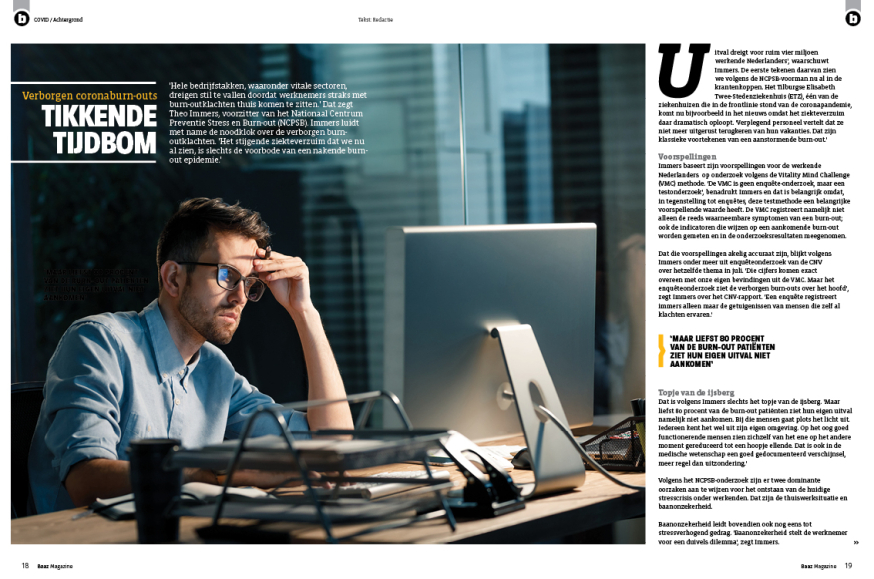 'Hele bedrijfstakken, waaronder vitale sectoren, dreigen stil te vallen doordat werknemers straks met burn-outklachten thuis komen te zitten.' Dat zegt Theo Immers, voorzitter van het Nationaal Centrum Preventie Stress en Burn-out (NCPSB). Immers luidt met name de noodklok over de verborgen burn-outklachten. 'Het stijgende ziekteverzuim dat we nu al zien, is slechts de voorbode van een nakende burn-out epidemie.'