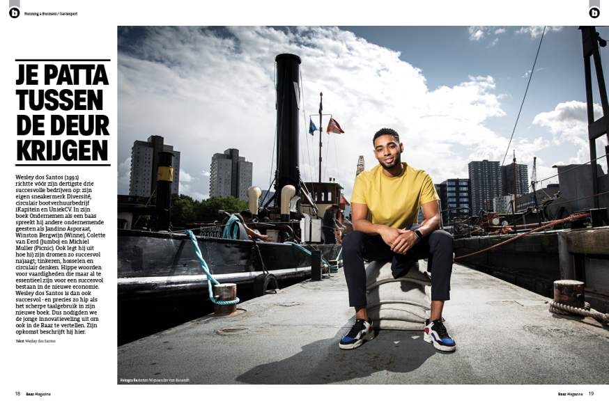 Wesley dos Santos (1991) richtte vóór zijn dertigste drie succesvolle bedrijven op: zijn eigen sneakermerk Diversité, circulair bootverhuurbedrijf iKapitein en UniekCV. In zijn boek Ondernemen als een baas spreekt hij andere ondernemende geesten als Jandino Asporaat, Winston Bergwijn (Winne), Colette van Eerd (Jumbo) en Michiel Muller (Picnic). Ook legt hij uit hoe hij zijn dromen zo succesvol najaagt; tinkeren, hosselen en circulair denken. Hippe woorden voor vaardigheden die maar al te essentieel zijn voor een succesvol bestaan in de nieuwe economie. Wesley dos Santos is dan ook succesvol - en precies zo hip als het scherpe taalgebruik in zijn nieuwe boek. Dus nodigden we de jonge innovatieveling uit om ook in de Baaz te vertellen. Zijn opkomst beschrijft hij hier.