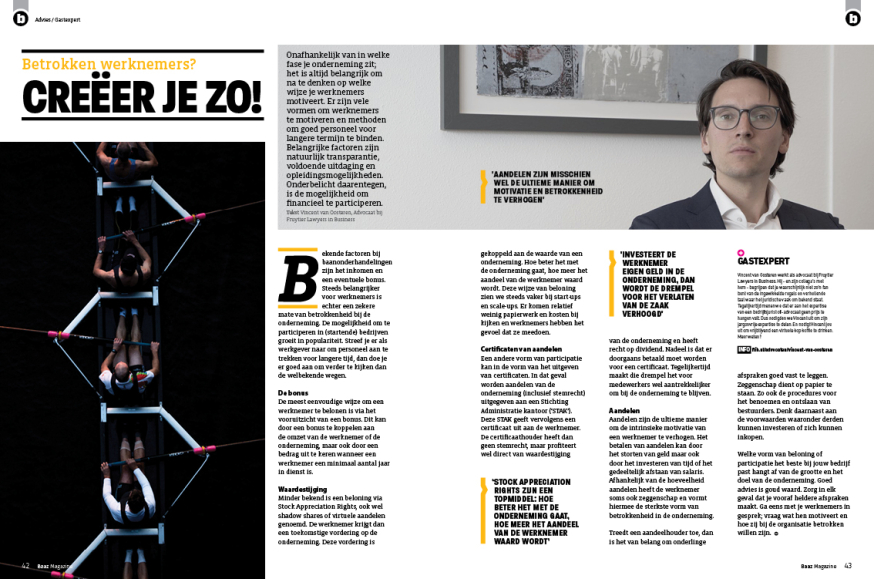 Het is altijd belangrijk om na te denken op welke wijze je werknemers motiveert, onafhankelijk van in welke fase je onderneming zit. Er zijn vele vormen om werknemers te motiveren en methoden om goed personeel voor langere termijn te binden. Belangrijke factoren zijn natuurlijk transparantie, voldoende uitdaging en opleidingsmogelijkheden. Onderbelicht daarentegen, is de mogelijkheid om financieel te participeren. Gastexpert Vincent Visser, advocaat bij Fruytier, belicht de opties.