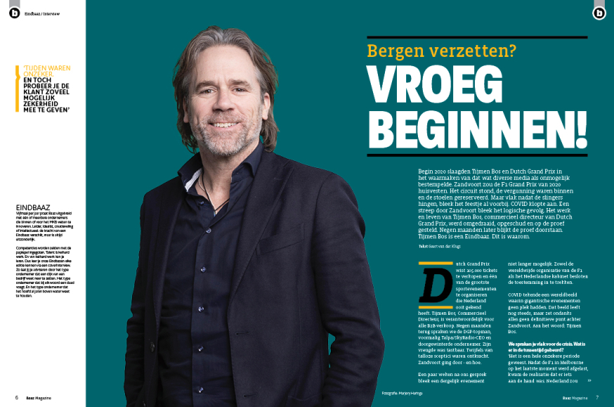 Begin 2020 slaagden Tijmen Bos en Dutch Grand Prix in het waarmaken van dat wat diverse media als onmogelijk bestempelde. Zandvoort zou de F1 Grand Prix van 2020 huisvesten. Het circuit stond, de vergunning waren binnen en de stoelen gereserveerd. Maar vlak nadat de slingers hingen, bleek het feestje al voorbij. COVID klopte aan. Een streep door Zandvoort bleek het logische gevolg. Het werk en leven van Tijmen Bos, commercieel directeur van Dutch Grand Prix, werd omgedraaid, opgeschud en op de proef gesteld. Negen maanden later blijkt de proef doorstaan. Tijmen Bos is een Eindbaaz. Dit is waarom.