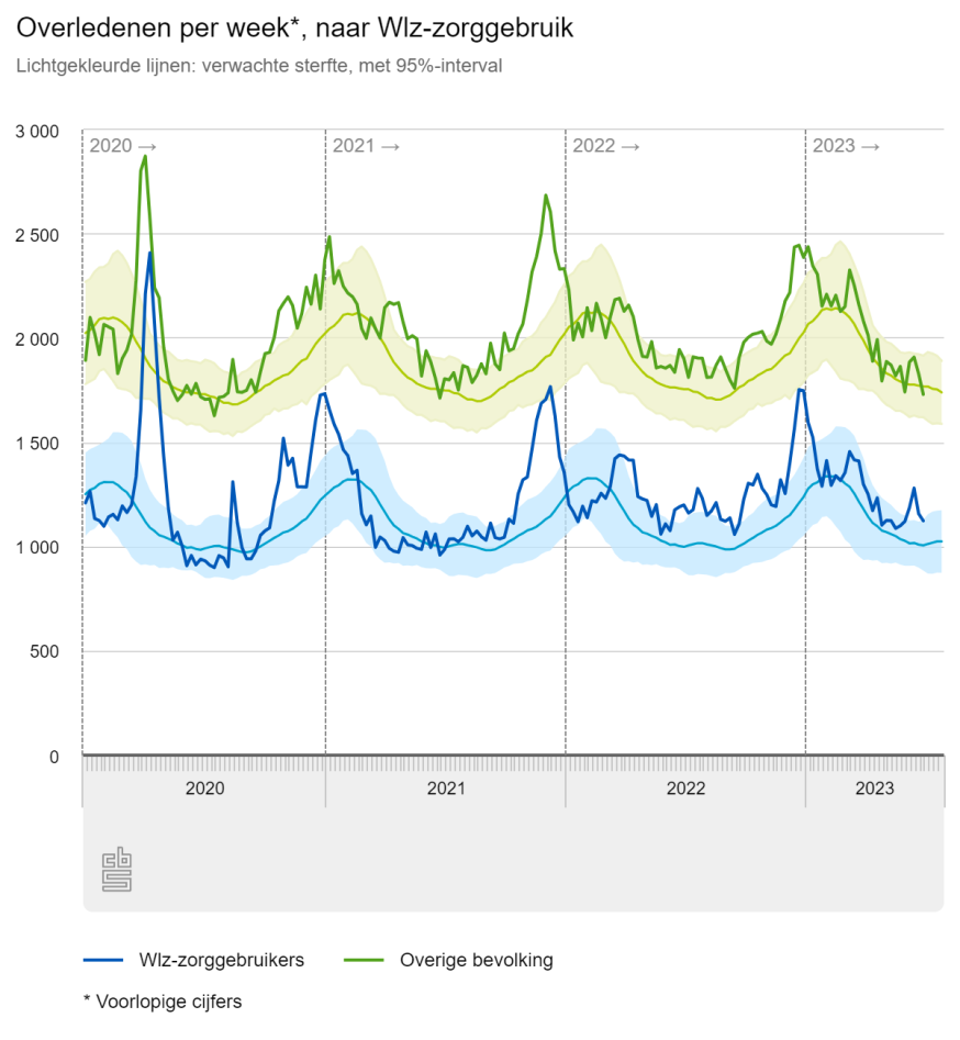 De sterfte bij mensen die zorg ontvingen in het kader van de Wet langdurige zorg (Wlz), zoals bewoners van verpleeghuizen en gehandicaptenzorginstellingen, was in het tweede kwartaal ongeveer 1 350 (10 procent) hoger dan verwacht. In juni was er in week 23 tot en met 25 oversterfte.