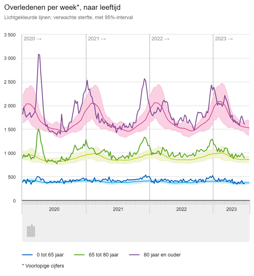 In het tweede kwartaal overleden bijna 900 (4 procent) meer 80-plussers dan verwacht voor die periode. In bijna alle weken was de sterfte hoger dan verwacht. In week 23 tot en met 25 was er sprake van oversterfte.
