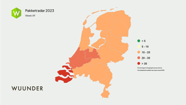 In de week van pakjesavond (week 49) was een op de vijf (18,8%) pakketten vertraagd. Dit blijkt uit de Pakketradar, een data-analyse van Wuunder. Hiermee is de gemiddelde vertraging vrijwel gelijk aan de week ervoor. Dat bijna twintig procent van de pakketten vertraagd is, is niet uitzonderlijk voor deze tijd van het jaar. Wel is het opvallend dat in week 49, over het algemeen een rustige week na Black Friday, twintig procent van de zendingen vertraagd is. Er is dan ook een stijging in het aantal vertragingen te zien ten opzichte van dezelfde week (week 49) in 2022. Toen was 6,8 procent van de pakketten vertraagd.