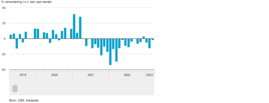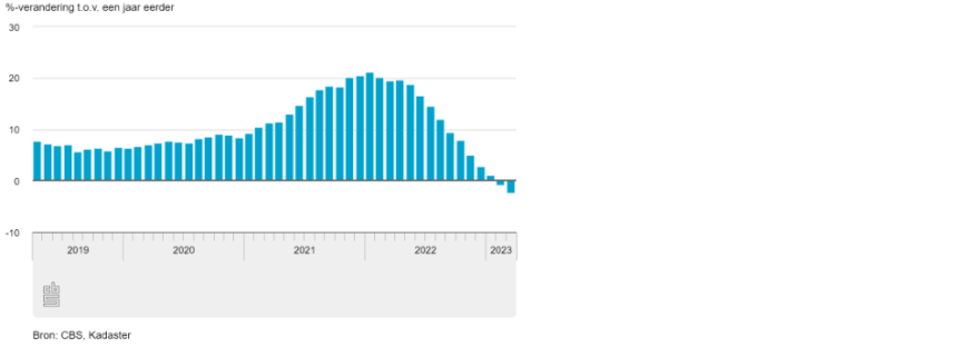 In maart waren de prijzen van bestaande koopwoningen gemiddeld 2,3 procent lager dan in maart 2022. Een maand eerder was de daling 0,8 procent ten opzichte van dezelfde maand vorig jaar. Dit blijkt uit onderzoek naar de prijsontwikkeling van bestaande particuliere koopwoningen in Nederland van het CBS en het Kadaster.