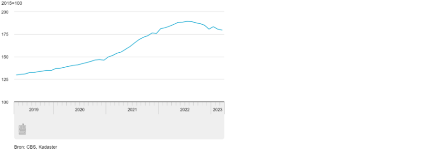 Ten opzichte van februari is de prijsindex bestaande koopwoningen in maart met 0,5 procent gedaald. De prijzen van bestaande koopwoningen bereikten in juni 2013 een dieptepunt. Vervolgens was er sprake van een stijgende trend, tot augustus 2022. Sindsdien is de prijsindex vrijwel onafgebroken gedaald. Vergeleken met het dal in juni 2013 waren de prijzen in maart ruim 89 procent hoger. De gemiddelde transactieprijs van een woning was in maart 415 141 euro.