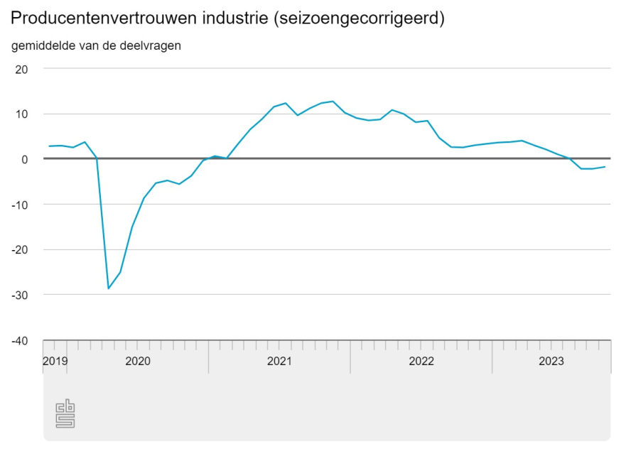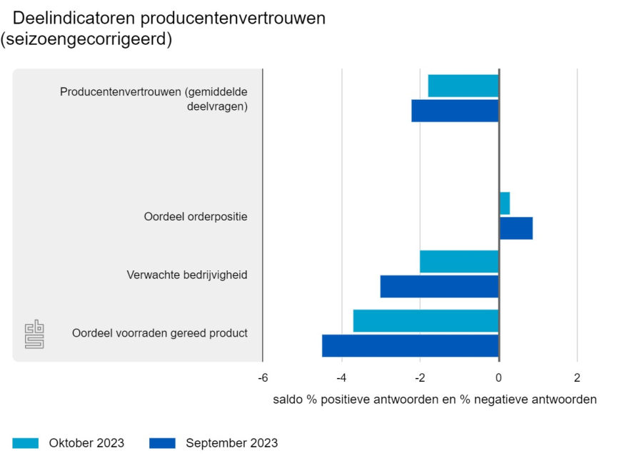 De producenten in de industrie waren in oktober iets minder negatief dan in september. Het vertrouwen ging van -2,2 in september naar -1,8 in oktober, aldus het CBS. Fabrikanten waren minder negatief over de verwachte bedrijvigheid in de komende drie maanden en de voorraden gereed product.