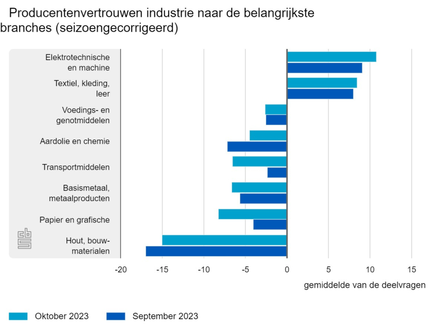 In de helft van de belangrijkste branches in de industrie verbeterde het producentenvertrouwen in oktober. Fabrikanten in de elektrotechnische en machine-industrie waren opnieuw het meest positief, terwijl producenten in de hout- en bouwmaterialenindustrie opnieuw het meest negatief waren.