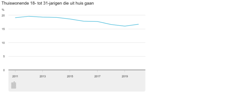 In 2019 verliet 16 procent van de 18- tot 31-jarige thuiswonenden het ouderlijk huis. In 2012 was dit nog 20 procent. Onder 18- tot 21-jarigen was de afname in uit huis gaan het sterkst. In 2012 ging 13 procent van de thuiswonende 18-jarigen uit huis, in 2019 nog maar 8 procent. Dat is een afname van ruim 40 procent.