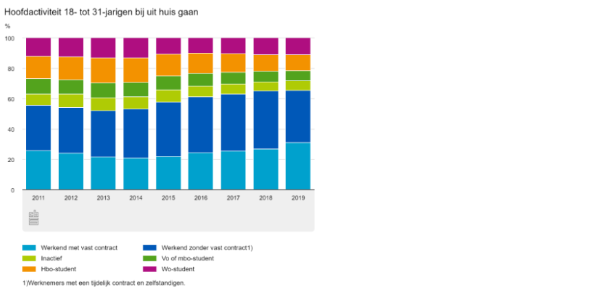 In 2019 werkte 66 procent van de jongvolwassenen bij het verlaten van het ouderlijk huis. In 2011 was dit nog 56 procent. Het aandeel dat nog naar school ging of studeerde nam juist af. Jongvolwassenen gingen gemiddeld later zelfstandig wonen, maar keerden ook minder vaak terug naar het ouderlijk huis. Dat blijkt uit een onderzoek van het CBS naar uit huis gaan en terugkeren van 18- tot 31-jarigen.