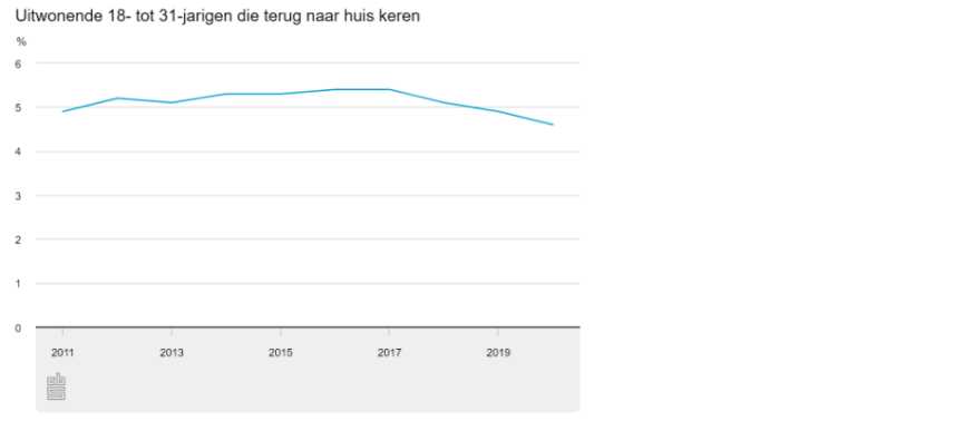Het aandeel uitwonende 18- tot 31-jarigen dat terugkeerde naar het ouderlijk huis (ook wel ‘boemerangkinderen’ genoemd) nam af van 5,4 procent in 2017 naar 4,6 procent in 2020. Dat is een afname van 15 procent. Jongvolwassenen kunnen om verschillende redenen weer bij hun ouders gaan wonen, bijvoorbeeld omdat zij in financiële moeilijkheden komen of hun relatie met de partner waarmee zij samenwoonden verbreken.