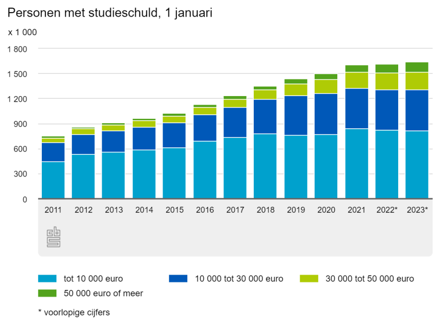 Begin 2023 hadden ruim 1,6 miljoen mensen een studieschuld. Na een jarenlange stijging is het aantal sinds 2021 nagenoeg gelijk gebleven.