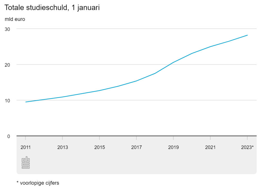 De totale studieschuld van huidige en oud-studenten was begin 2023 opgelopen tot 28,2 miljard euro. Dat is een toename van 1,7 miljard euro ten opzichte van het jaar ervoor. De studieschuld loopt elk jaar op en is meer dan verdubbeld sinds de invoering van het leenstelsel in 2015. Dat meldt het CBS op basis van nieuwe cijfers.