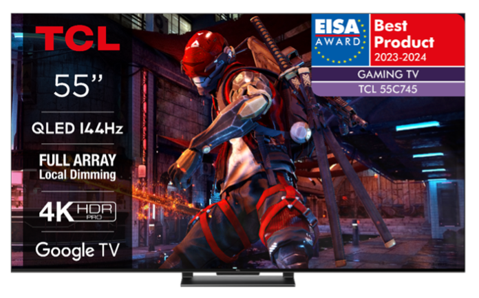 • De TCL QLED 4K TV 55C745, bekroond als winnaar van de EISA 'GAMING TV 2023-2024' award, is de ultieme keuze voor gaming op de nieuwste generatie consoles en pc's. Het combineert spectaculaire kleuren van QLED, contrast van Full Array Lo cal Dimming en piekhelderheid met alle nieuwste gamingfuncties. Game Master 2.0, HDMI 2.1, ALLM, 144Hz VRR, FreeSync Premium Pro, TCL Game Bar, 240Hz Game Accelerator tillen de game-ervaring naar een hoger niveau. Dankzij deze functies kan de TCL 55C745 zich aanpassen aan elke gamesource. In combinatie met AMD FreeSync-technologie, die naadloos, artefactvrij gameplay belooft bij bijna elke framesnelheid, kunnen gebruikers de volgende doorbraak in pc- en console gaming verwachten.
