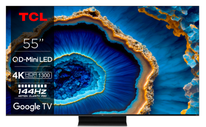 • De TCL 55C805 TV is ook een topkeuze voor gamers. Het combineert 5e generatie Full Array Mini LED, QLED, 4K HDR Premium 1300, en 144Hz Motion Clarity Pro voor krachtig nauwkeurig contrast, scherpe en kleurrijke HDR-beeldkwaliteit. Met Game Master Pro 2.0, 144Hz VRR, Game Bar, 240Hz Game Accelerator en de nieuwste ondersteunde HDR-formaten is deze TCL Mini LED TV het beste gezelschap om van games te genieten.