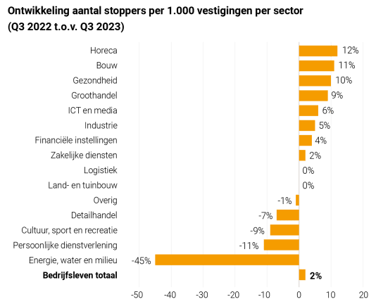Gekeken naar de ontwikkeling van het aantal starters per duizend vestigingen, is er vooral een toename waarneembaar in de sectoren Detailhandel, ICT en media en Persoonlijke dienstverlening. Een toename van het aantal stoppers per duizend vestigingen is vooral te zien in de Horeca, de Bouw, de Zorg en de Groothandel. Over heel Nederland bekeken, nam alleen in Groningen en Limburg het aantal starters toe, in de rest van de provincies was per 10.000 inwoners een afname ten opzichte van Q3 in 2022 te zien.