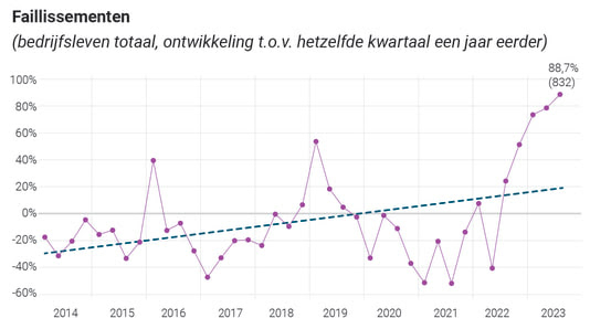 Het aantal faillissementen blijft in historisch perspectief relatief laag (832 in Q3 2023). In de afgelopen vijf kwartalen nam het aantal faillissementen echter wel toe. In Q3 van 2023 was het fors hoger dan in hetzelfde kwartaal vorig jaar, toen het aantal faillissementen 441 bedroeg.