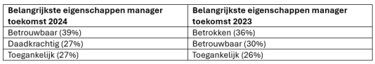 Eigenschappen die huidige managers kenmerken, wijken hier ook net vanaf: betrouwbaar (35%), behulpzaam (26%) en betrokken (25%).