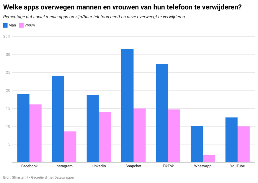 Er zijn op dit vlak grote verschillen tussen mannen en vrouwen. Mannen blijken namelijk vaker uitgekeken te zijn op social media-apps dan vrouwen. Vooral ‘plaatjes en filmpjes kijken’ op Instagram, Snapchat of TikTok hoeft van veel mannen niet meer zo nodig. De app die vrouwen het vaakst kunnen missen is daarentegen Facebook. Ook opvallend: een op de tien mannen zegt te overwegen te stoppen met Whatsappen, vijf keer zoveel als bij de vrouwen.