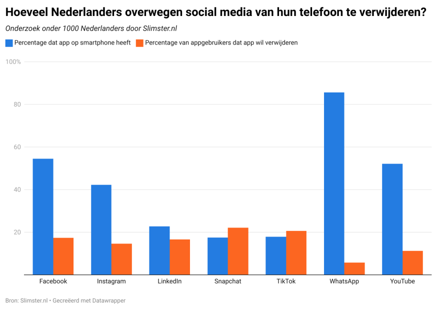 In samenwerking met onderzoeksbureau Panel Inzicht vroeg Slimster duizend Nederlanders welke apps zij op hun smartphone hebben en in hoeverre zij overwegen deze eraf te gooien. WhatsApp blijkt verreweg de meestgebruikte app, gevolgd door Facebook en YouTube. Het zijn echter met name Snapchat en Instagram die het vaakst genoemd worden als kandidaat om verwijderd te worden.