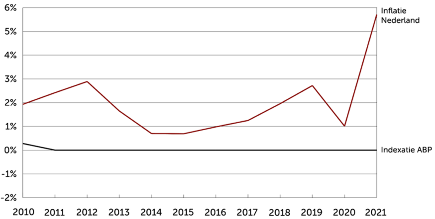 Afbeelding: De indexatie van pensioenfonds ABP van 2010 tot en met 2020, afgezet tegen de inflatie in Nederland in dezelfde periode. Cijfers afkomstig van ABP en DNB.