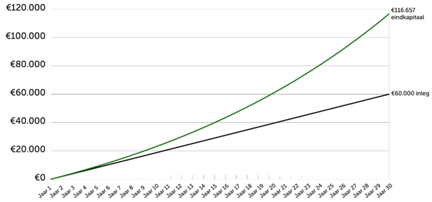 Maar eigenlijk zou een jongere werknemer minder premie hoeven te betalen dan een oudere werknemer. Dat komt omdat er met de premie van die jongere werknemer langer belegd kan worden. Als u bijvoorbeeld 30 jaar de tijd heeft en gemiddeld 4% rendement per jaar behaalt, is er een inleg van €2.000 per jaar nodig om een bedrag van bijna €117.000 op te bouwen.