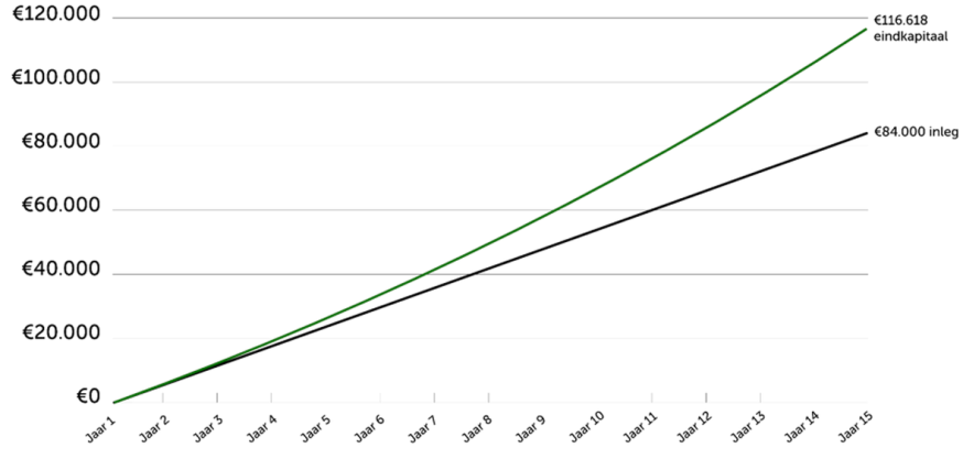 Heeft u maar 15 jaar de tijd? Dan is er veel meer inleg nodig, omdat het geld minder lang kan renderen. U moet dan €5.600 per jaar inleggen om op hetzelfde bedrag uit te komen.