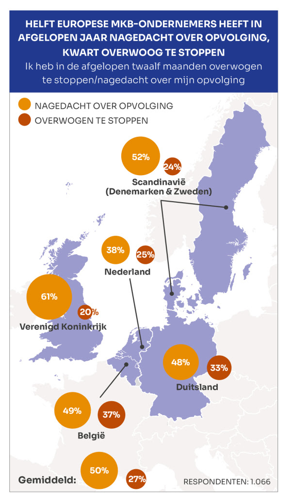 Hoewel Nederlandse ondernemers in vergelijking met hun Europese collega's relatief gelukkig zijn met hun werk (87% haalt er voldoening uit), overweegt een derde van hen te stoppen met ondernemen. Ze hebben echter geen duidelijk plan over hoe ze dit moeten aanpakken: maar liefst zes op de tien Nederlandse ondernemers heeft geen duidelijke exit-strategie. Dit en meer blijkt uit de nieuwste driemaandelijkse Europese Bedrijfsovernamebarometer van Marktlink.